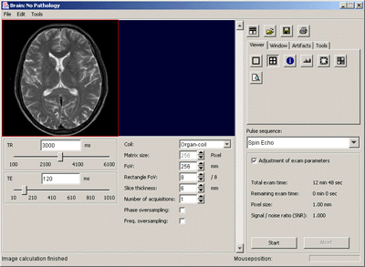 On a 500 MHz PC the software calculates an image in 5 to 20 seconds, depending on the pulse sequence and the degree of the desired artifacts.